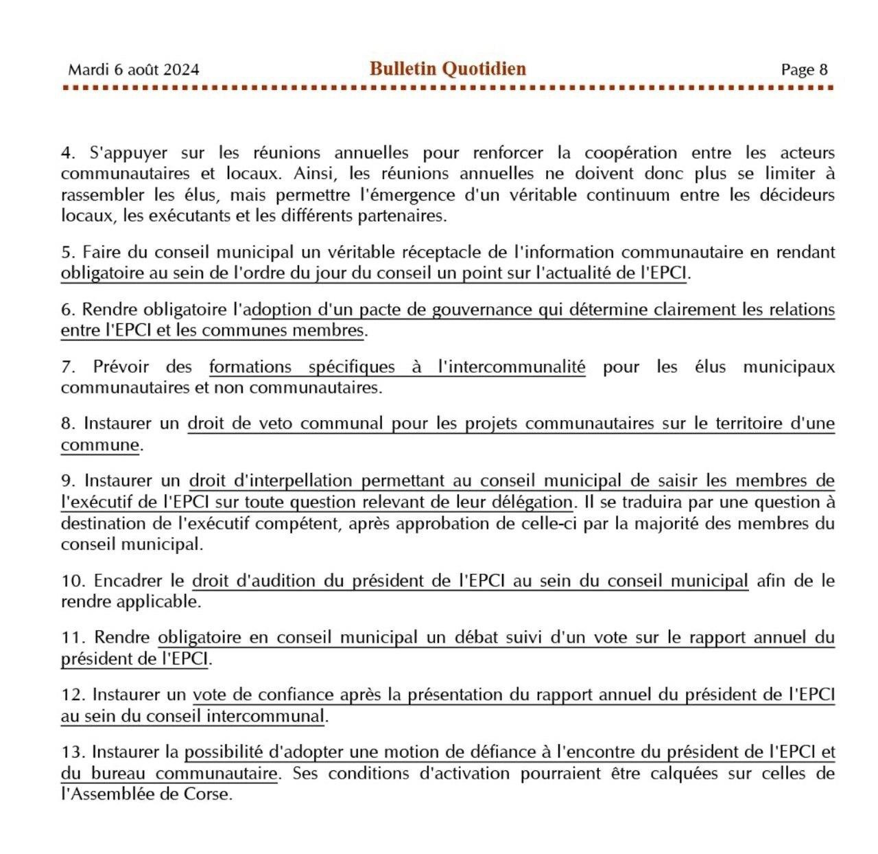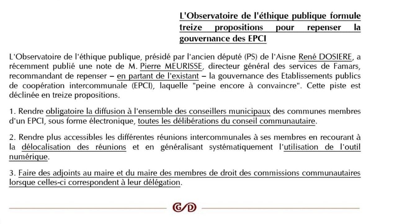 L'Observatoire de l'éthique publique a très récemment publié une note de M.Pierre Meurisse, directeur général des services de Famars, recommandant de repenser, en partant de l'existant, la gouvernance des établissements publics de coopération intercommunale (EPCI), laquelle peine encore à convaincre. Cette poste est déclinée en treize propositions.