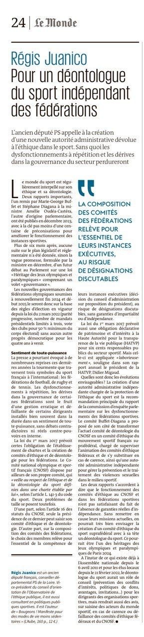 L’ancien député PS appelle, dans une tribune au « Monde », à l’institution d’une nouvelle autorité administrative indépendante dévolue à l’éthique dans le sport. Sans quoi « les dysfonctionnements à répétition et les dérives dans la gouvernance de certaines fédérations » sportives perdureront.
